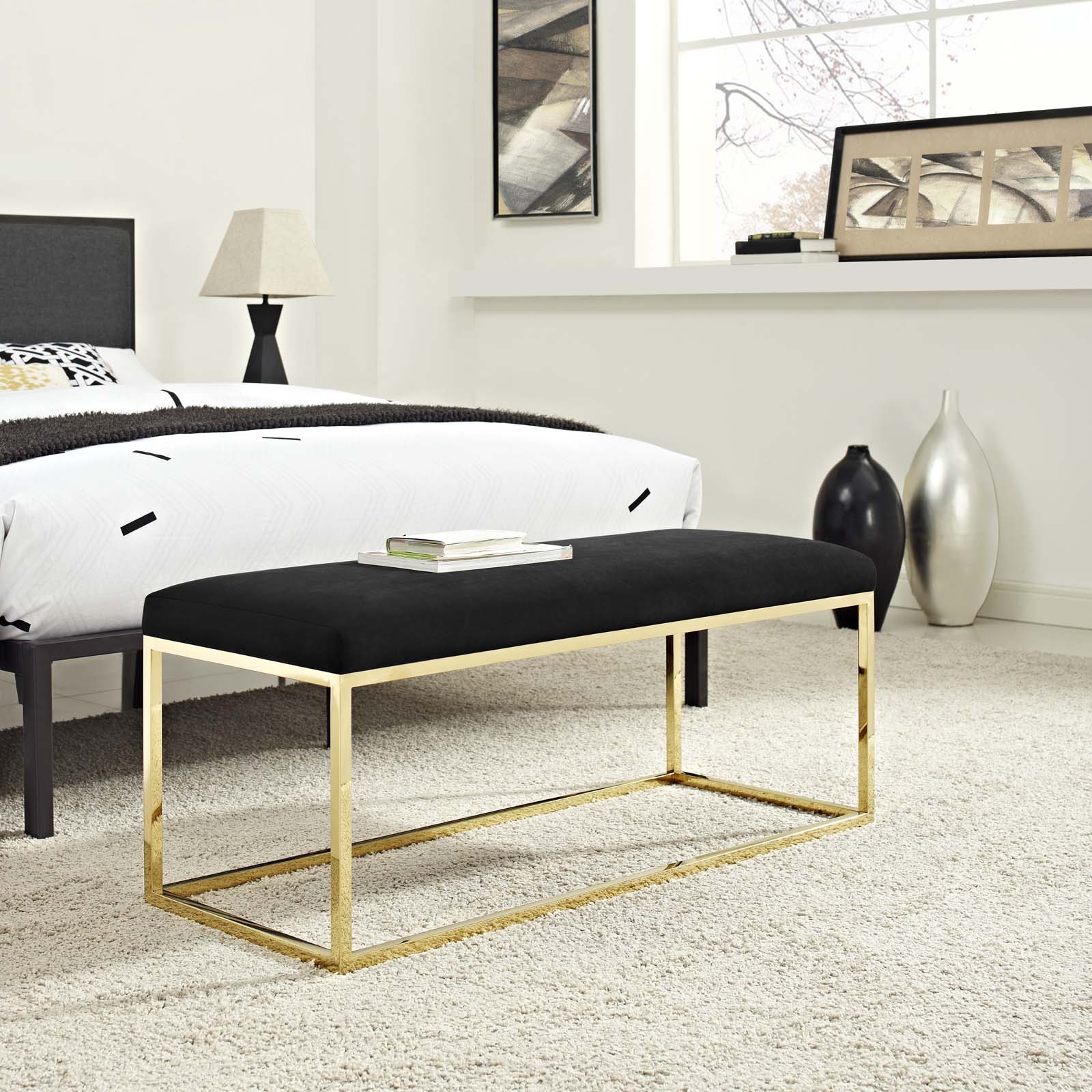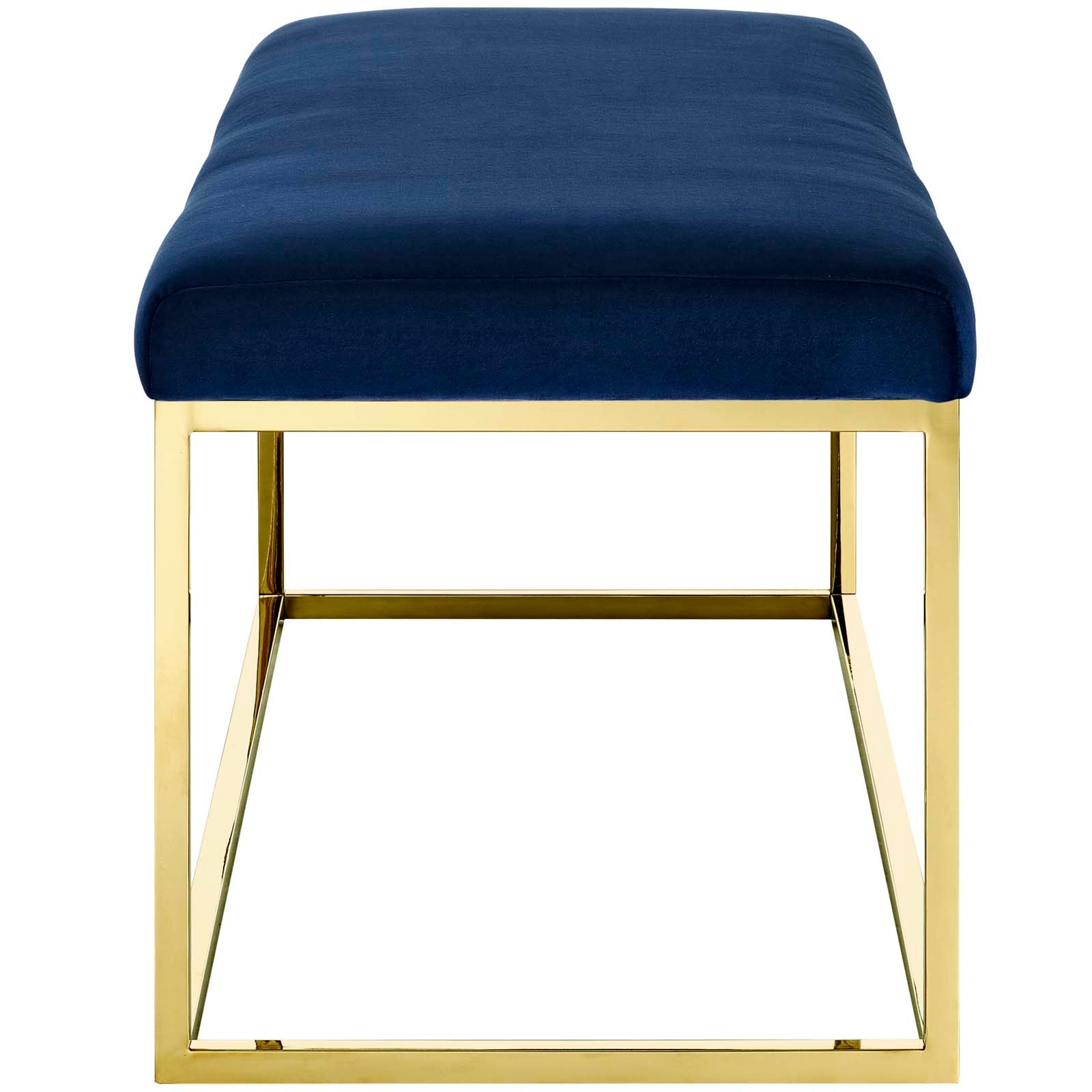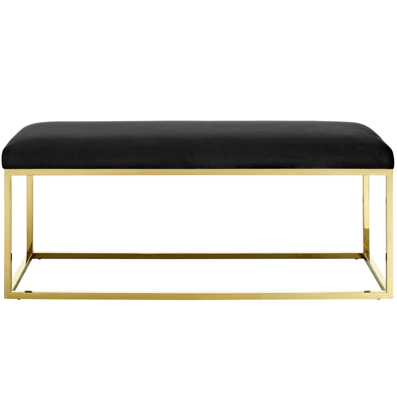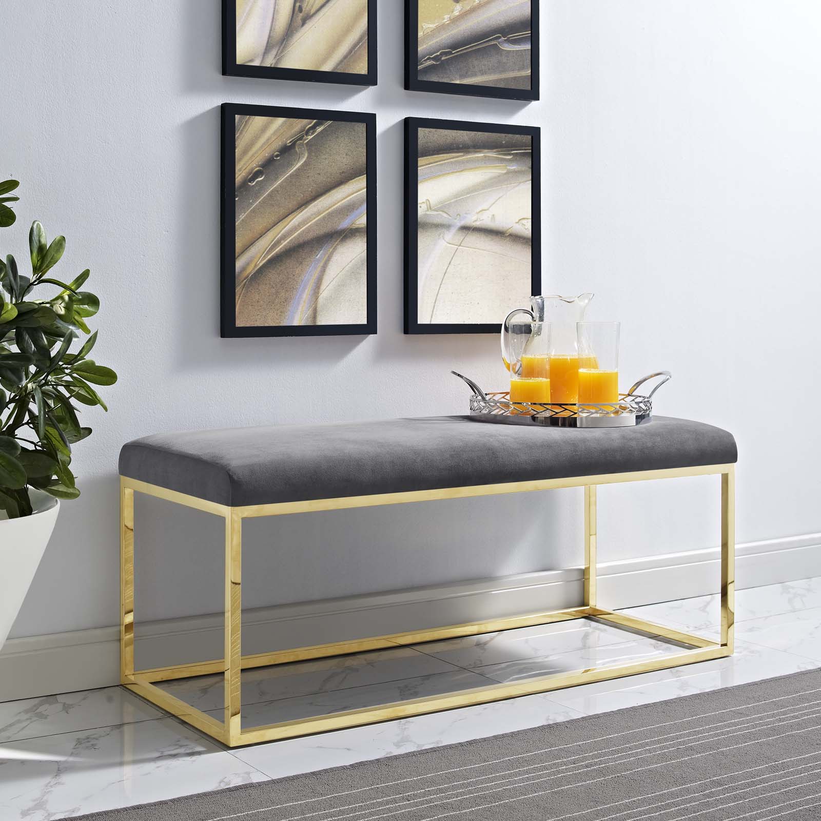Make a statement with Anticipate. Brimming with clean lines and a sleek modern look, Anticipate features a polished stainless steel base, elegant velvet polyester fabric top, and non-marking foot caps that help protect your flooring. The perfect addition to your bedroom, living space or entryway, Anticipate is a versatile bench that combines comfort and style with a supportive seat cushion and weight capacity up to 331 lbs. No assembly required.