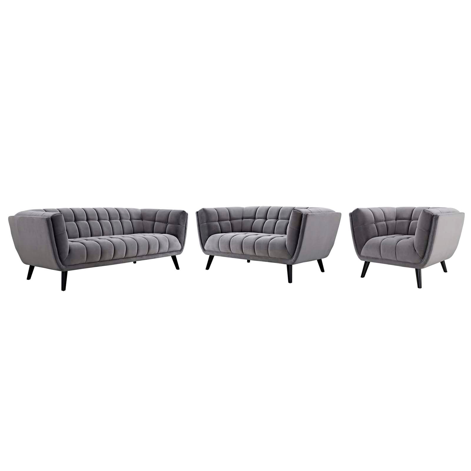 Generously update your décor with Bestow Performance Velvet Living Room Set. Uniquely designed with a striking broad profile, Bestow comes in soft, stain-resistant performance velvet polyester upholstery with dense foam padding and elegant button tufting. Sturdily positioned on splayed and tapered black finish wood legs with non-marking foot caps, Bestow boasts a bountiful living room seating design brimming with possibilities. With ample seat depth and overscaled frame, invite all your guests to sit comfortably in this 12" high back and arm rest collection perfect for mid-century, modern farmhouse or contemporary decors.