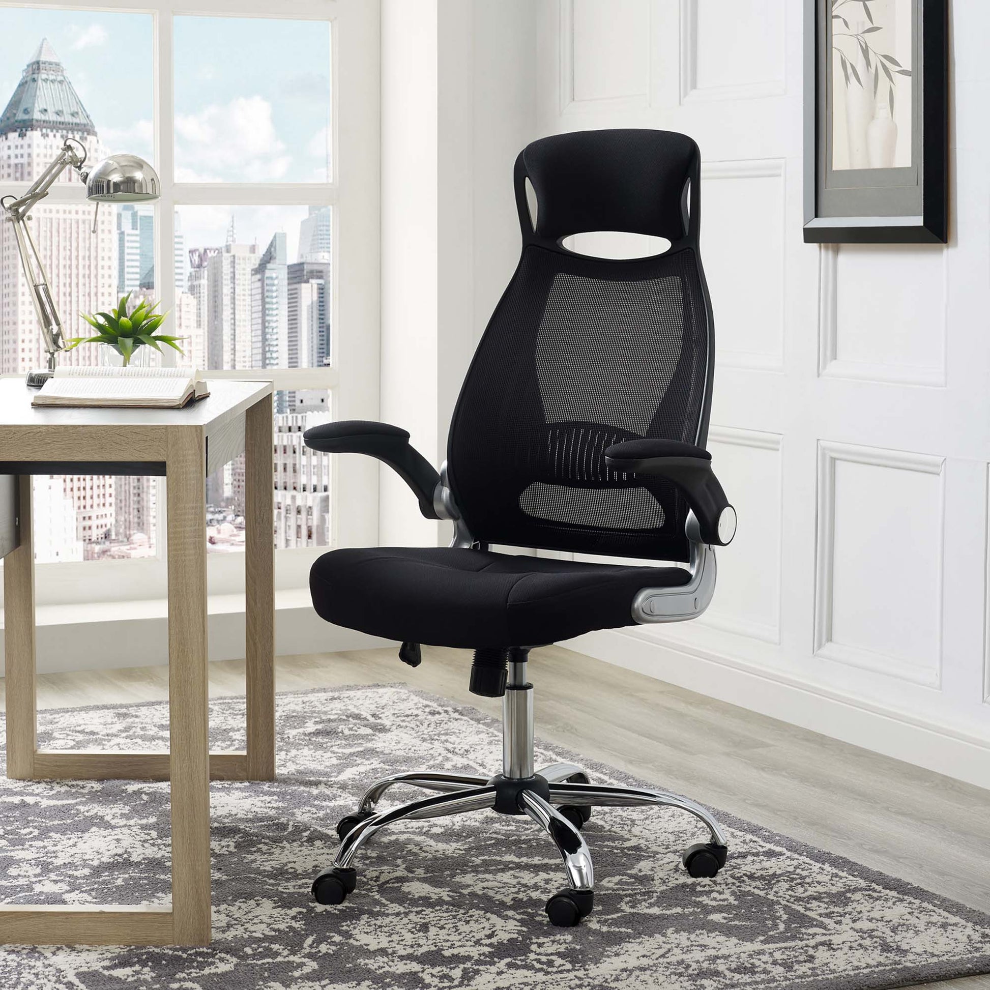 Exhibit command potential with the Expedite Highback Office Chair. Expedite’s breathable mesh back is ergonomically designed to assist back and shoulder posture, while the lower portion provides excellent lumbar support. A padded mesh headrest completes the managerial look of this executive office chair, while padded flip-arms add to the versatility. Complete with a densely padded mesh seat, 360-degree swivel, one-touch pneumatic height adjustment, a tilt-tension control knob, and five hooded dual-wheel nylon casters on a chrome plated aluminum base, glide comfortably over carpeted floors while staying ready for the tasks at hand.
