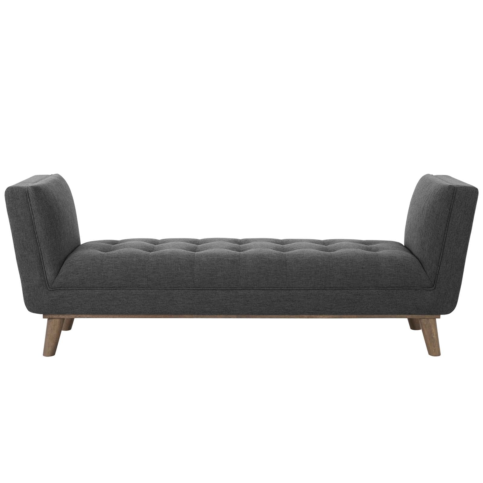 Sail away with the Haven accent bench. Subtle piping blends with biscuit tufting adorn Haven's generously sized seat with artistry and grace. Haven features dense foam padding covered by soft polyester fabric upholstery for premium seating comfort. Organically flared arms rise from this mid-century accent bench to enhance the decor of your living room, lounge area, bedroom, entryway, or home office. Haven's sturdy rubberwood frame can support up to 800 lbs and rests securely on four splayed wooden legs.