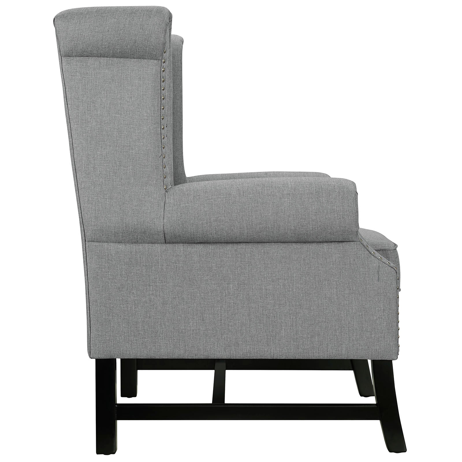 Enrich your leisure time with the Steer Armchair. Luxuriously tufted buttonswith ornately rolled armrests and back featuring elegant nailhead trim, Steer makes it easy to chart the course through many enjoyable living or lounge room excursions. Exquisitely upholstered in finely upholstered polyester, dense foam padding, and black stained wood legs, Steer works well in vintage, rustic, cabin, contemporary, global, and other eclectic spaces.