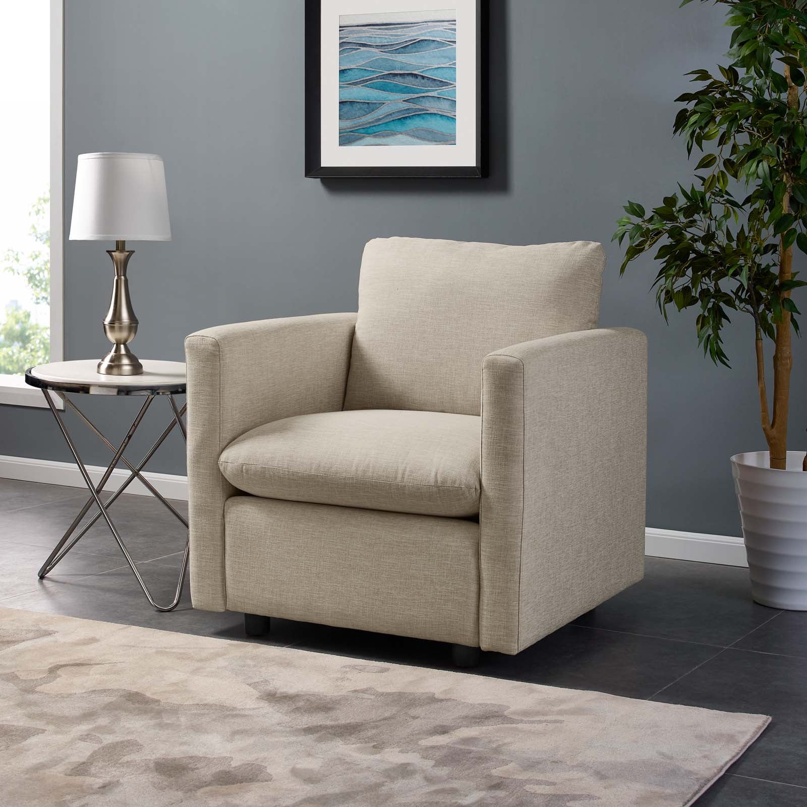 Détendez-vous avec style avec Activate. Un ajout polyvalent à une salle familiale, un appartement, un bureau ou un petit espace de vie, Activate est une chaise moderne et confortable fabriquée avec un rembourrage en mousse dense, recouverte d'un tissu en polyester doux et de pieds en bois noir. Dites adieu à l'époque où vous transportiez des meubles lourds. Activate offre la commodité d'aujourd'hui car il est livré directement à votre domicile ou à votre appartement dans une boîte portable et compacte. Avec une esthétique décontractée mais sur mesure, cette chaise d'appoint de salon se déballe facilement pour devenir un coin salon préféré dans votre maison. Capacité de poids de la chaise : 441 lb.