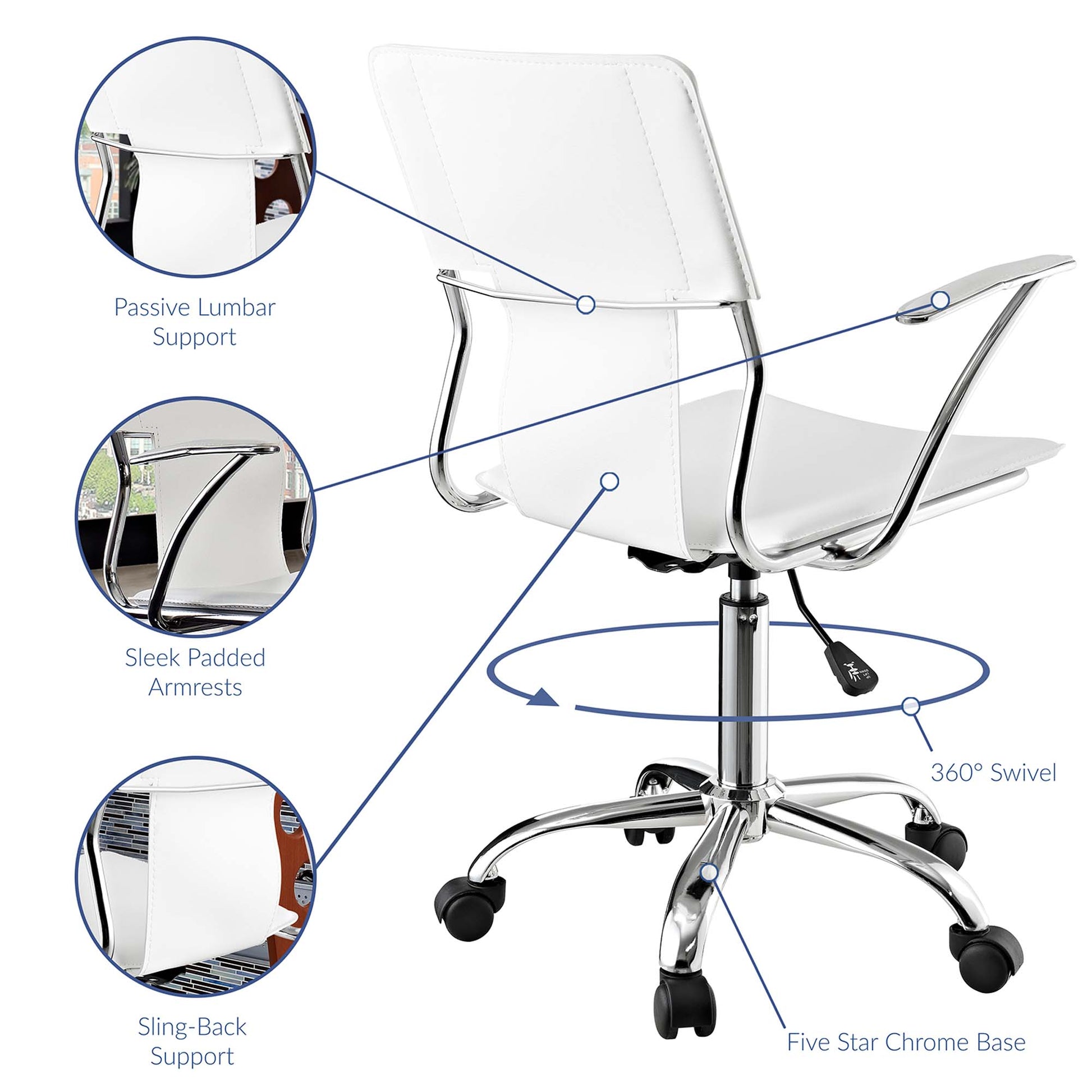 Propulsez-vous vers une version plus moderne et progressiste de vous-même. Studio est doté d'un dossier élégant en forme de sangle et d'accoudoirs aérodynamiques pour maximiser l'élan. Équipé d'accoudoirs rembourrés et d'un cadre en acier chromé brillant, attirez l'attention tout en vous préparant aux tâches à accomplir. Studio est également doté d'un bouton de tension pour personnaliser l'expérience de « décollage » de l'angle du dossier.