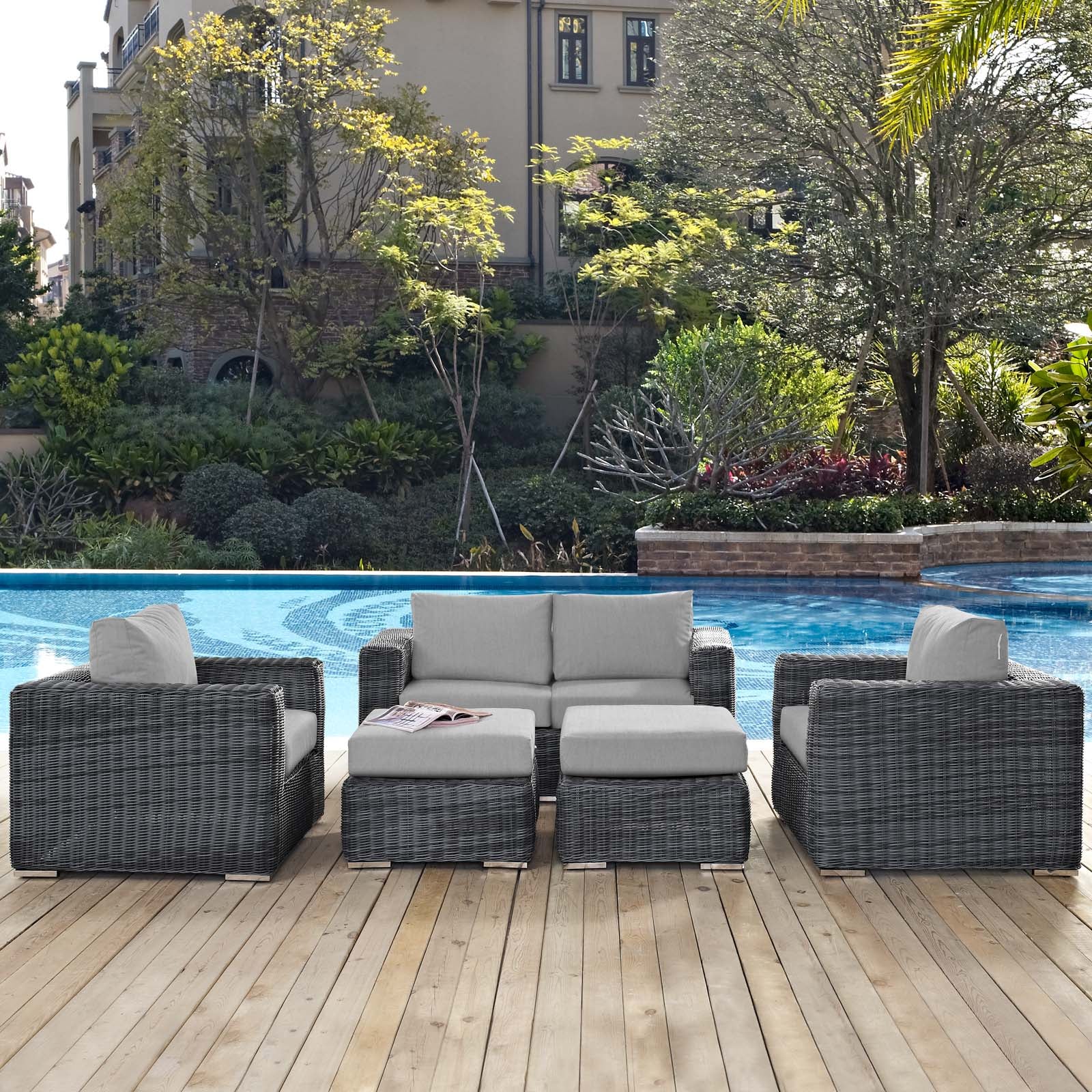 This Summon 5 Piece Outdoor Patio Sunbrella® Sectional Set is crafted to suit kosher living. Ideal for Shabbat gatherings, Jewish traditions, and daily comfort in your home.