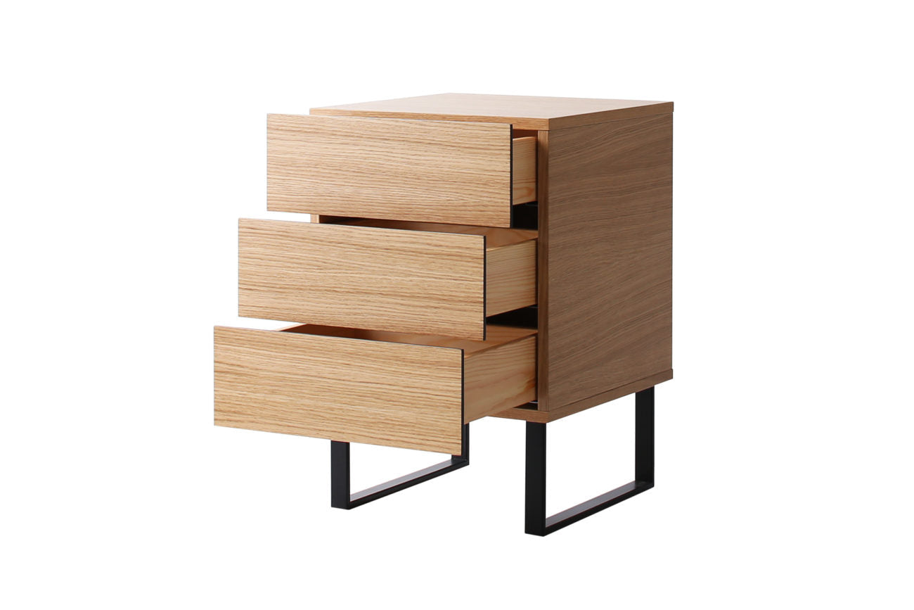 די מעטאַלענע פֿיס פֿונעם נאַכטטישל, קאָמבינירט מיט זײַן האָלצערנעם קערפער, שאַפֿן אַ ליכטיקע און באַלאַנסירטע פֿאָרעם.