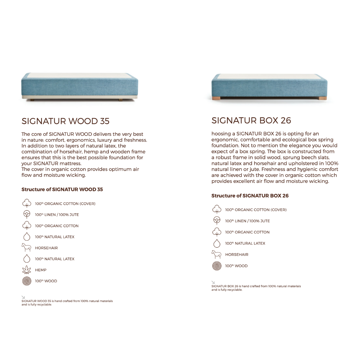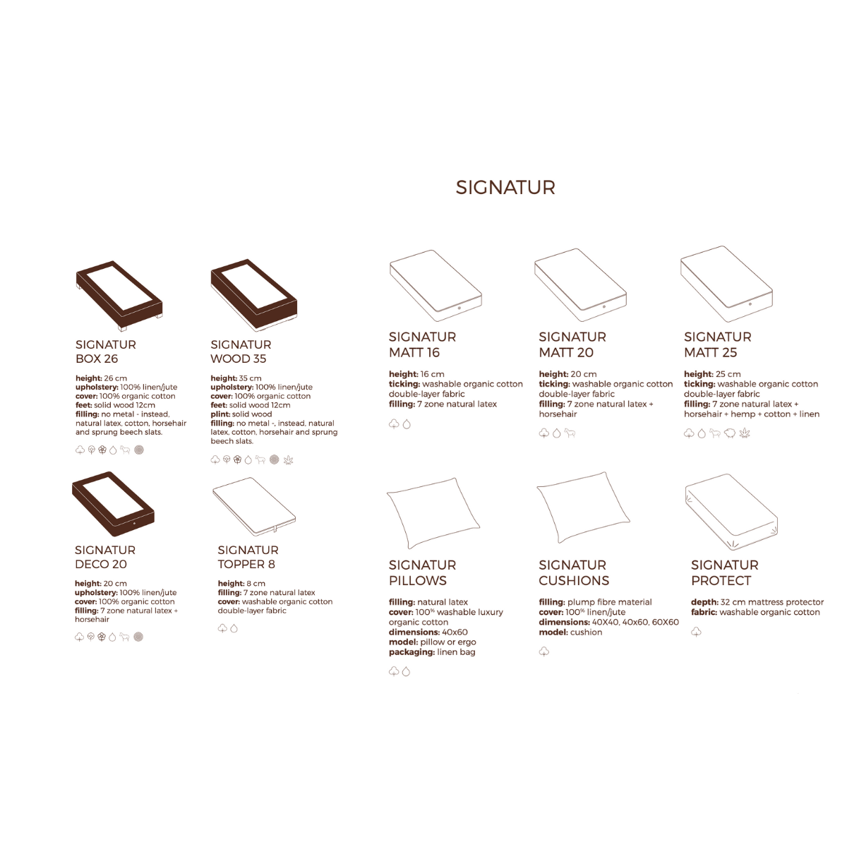 קאַסטאַמייז SIGNATUR פּראָדוצירט העכסטע קוואַליטעט שלאָף קאָמפאָרט אויף אַן עקאָלאָגישן וועג. ערגאָנאָמיש, באַקוועם און 100% נאַטירלעך. אויף דעם אופן וועט איר נישט בלויז פילן פרישער אין דער פרי, נאָר איר וועט אויך האָבן מער רוחניות שלום. וואָס מאכט איר שלאָפן אפילו בעסער.